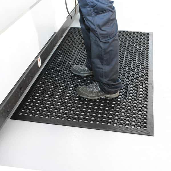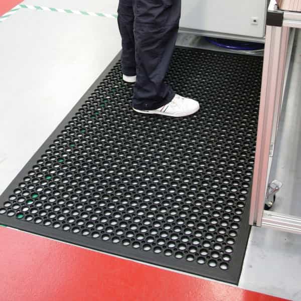 Mata gumowa antypoślizgowa. Ocena właściwości:  antypoślizgowe ( 4/5) , antyzmęczeniowe ( 3/5) , odporność na zużycie ( 4/5),  do środowiska: suche lub mokre